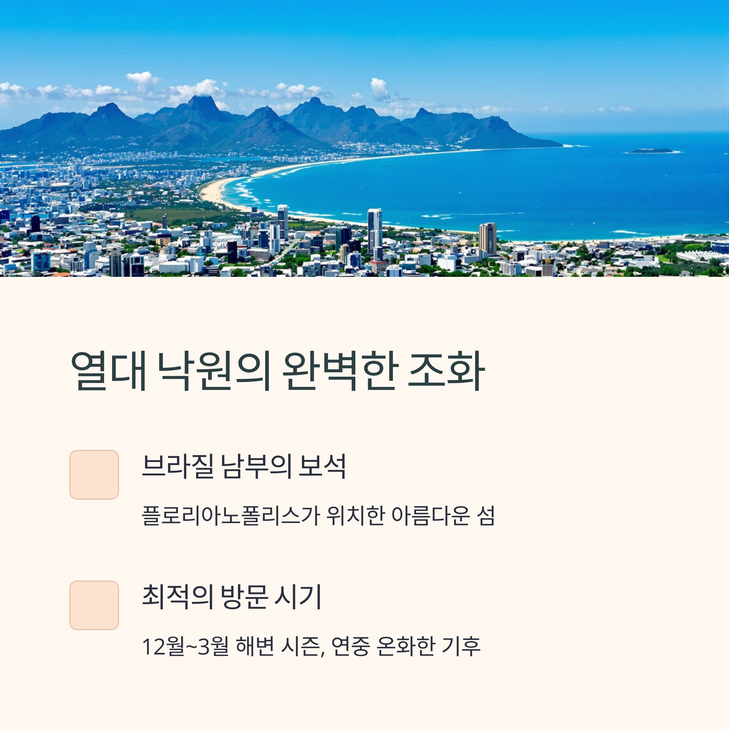 산타카타리나 섬은 브라질 남부에 위치한 보석 같은 섬이에요. 주도인 플로리아노폴리스를 포함하며, 청정한 자연과 한적한 분위기로 유명하죠. 기후는 온화한 편이라 사계절 내내 여행하기 좋아요. 하지만 해변을 제대로 즐기려면 12월~3월 사이 여름 시즌이 가장 좋아요.
