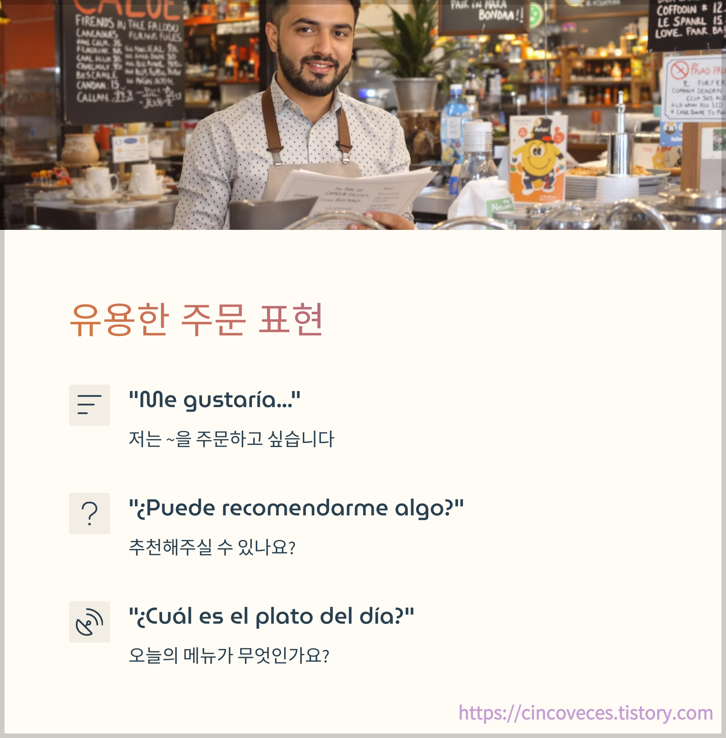 | [초급반 27일차] 초보도 바로 쓰는 음식 주문 스페인어 표현 총정리 (5) | 2025.03.28 |