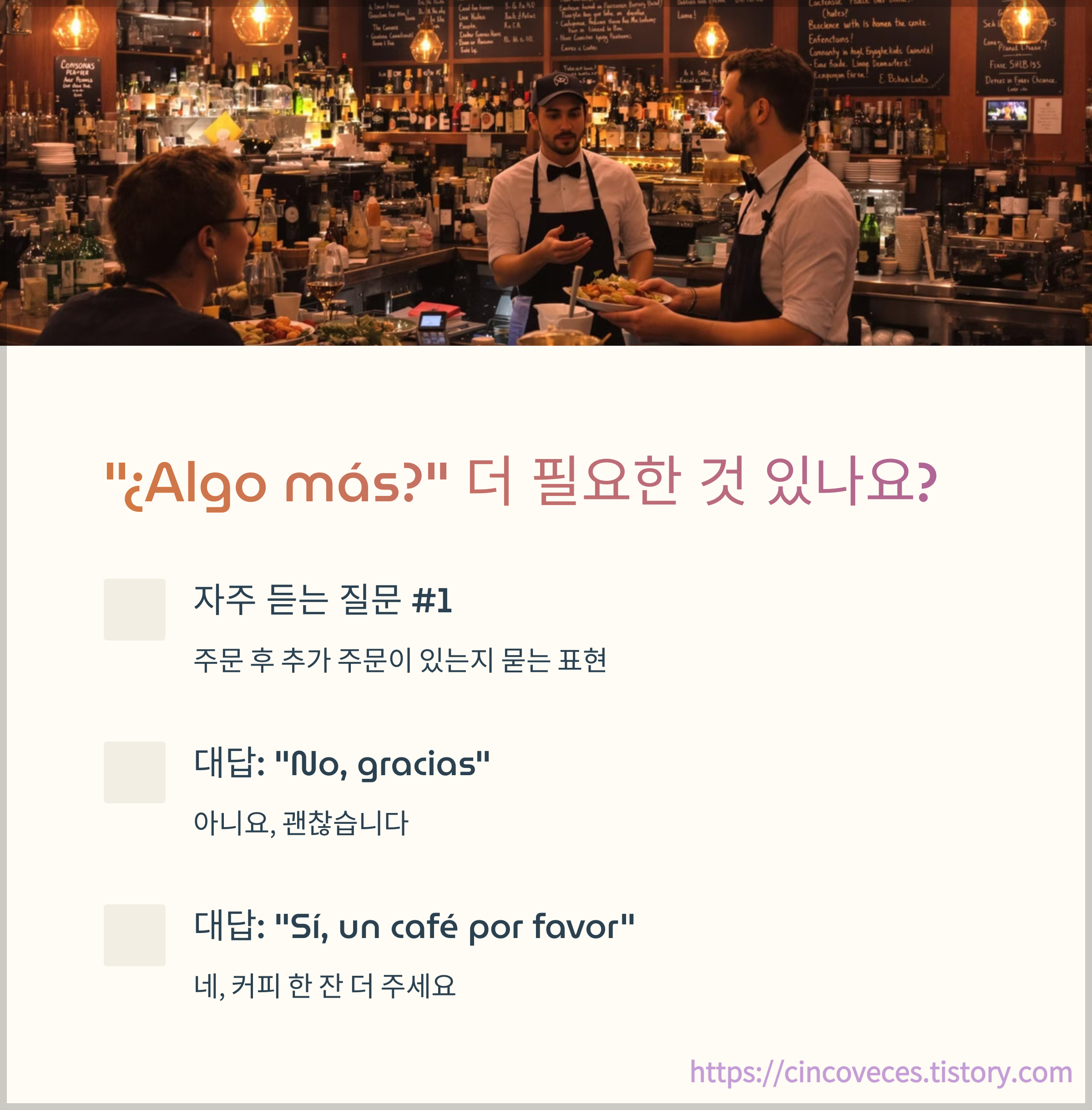 스페인어로 주문을 잘했다고 해서 끝이 아니에요. 진짜 당황하는 순간은 그다음, 직원이 무언가 물어볼 때죠. 그래서 오늘은 식당에서 자주 들을 수 있는 응답 표현과 그에 대한 간단한 대답들을 정리해봤어요.