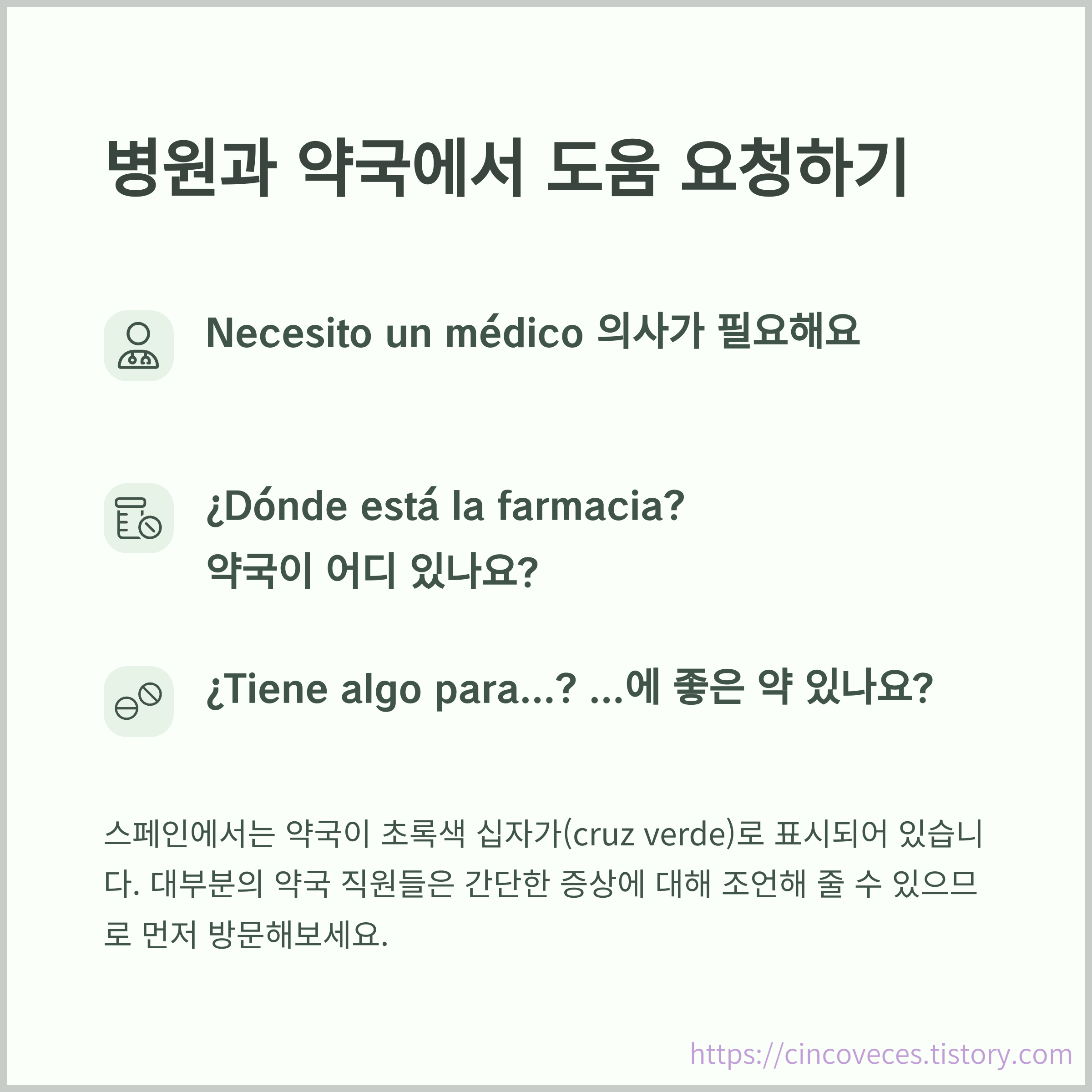 "¿Dónde está el hospital más cercano?", "¿Hay una farmacia cerca?", "Necesito medicina para el dolor" 등 상황에 따라 유용합니다.