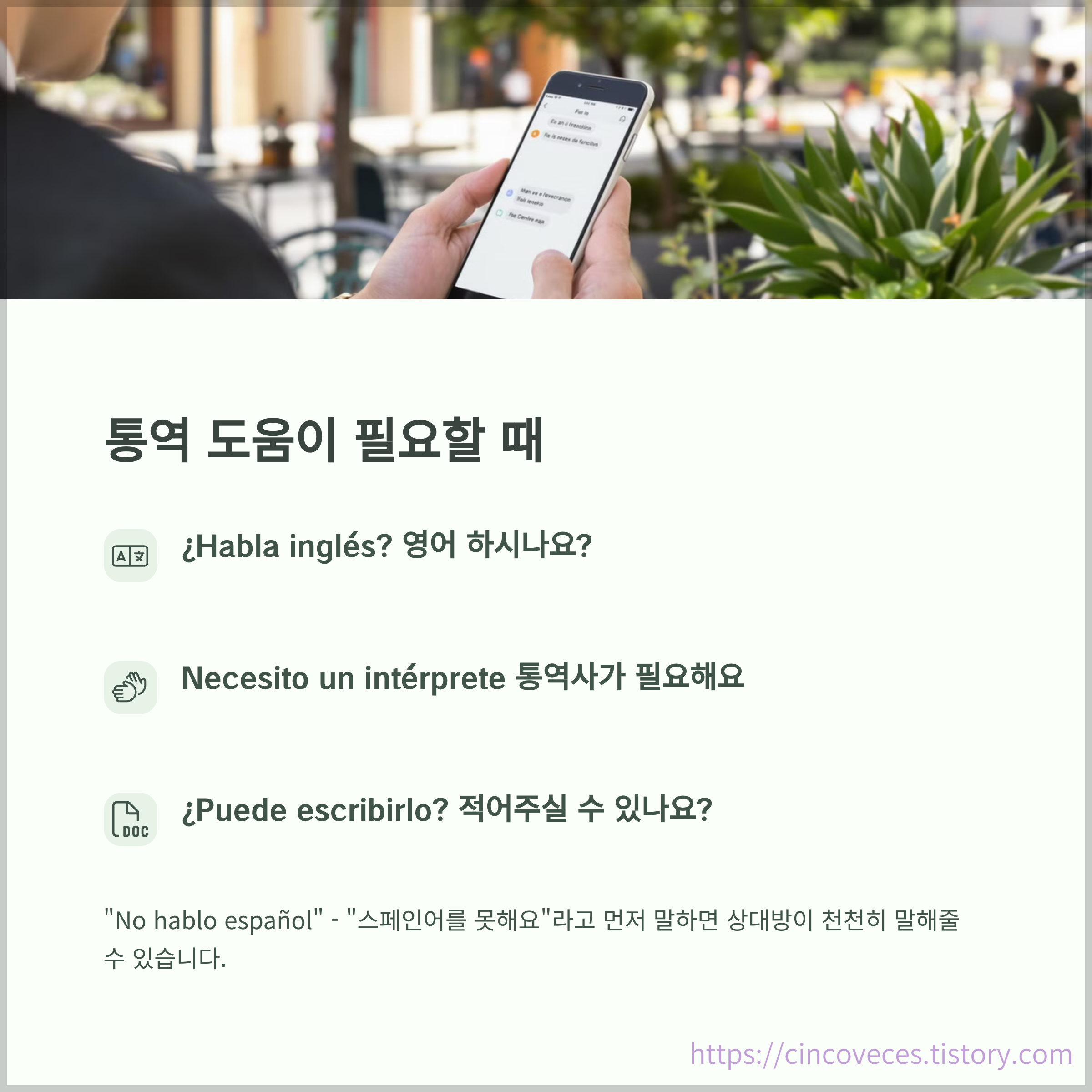 "No entiendo, ¿puede hablar más despacio?", "¿Hay alguien que hable inglés?"는 언어 도움을 받을 수 있는 표현입니다.