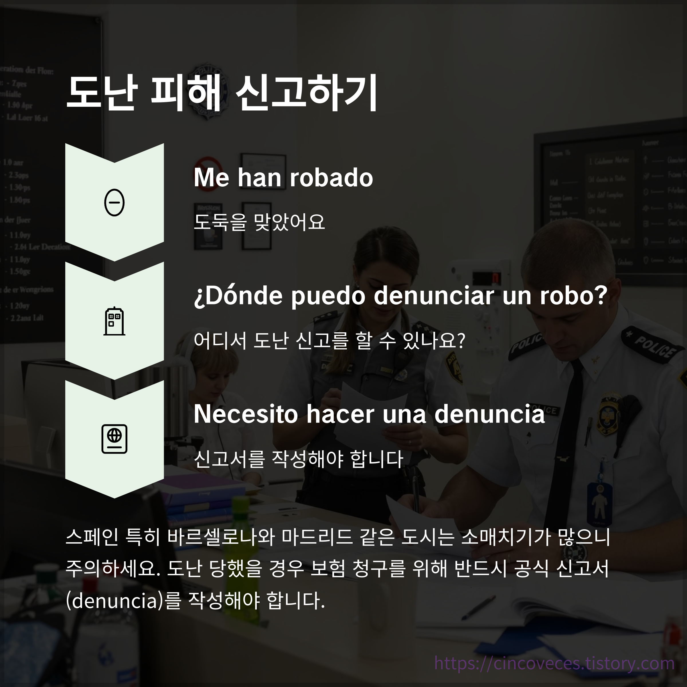 "Necesito ayuda", "¿Dónde está la comisaría?"는 경찰서나 도움을 요청할 때 유용한 문장입니다.