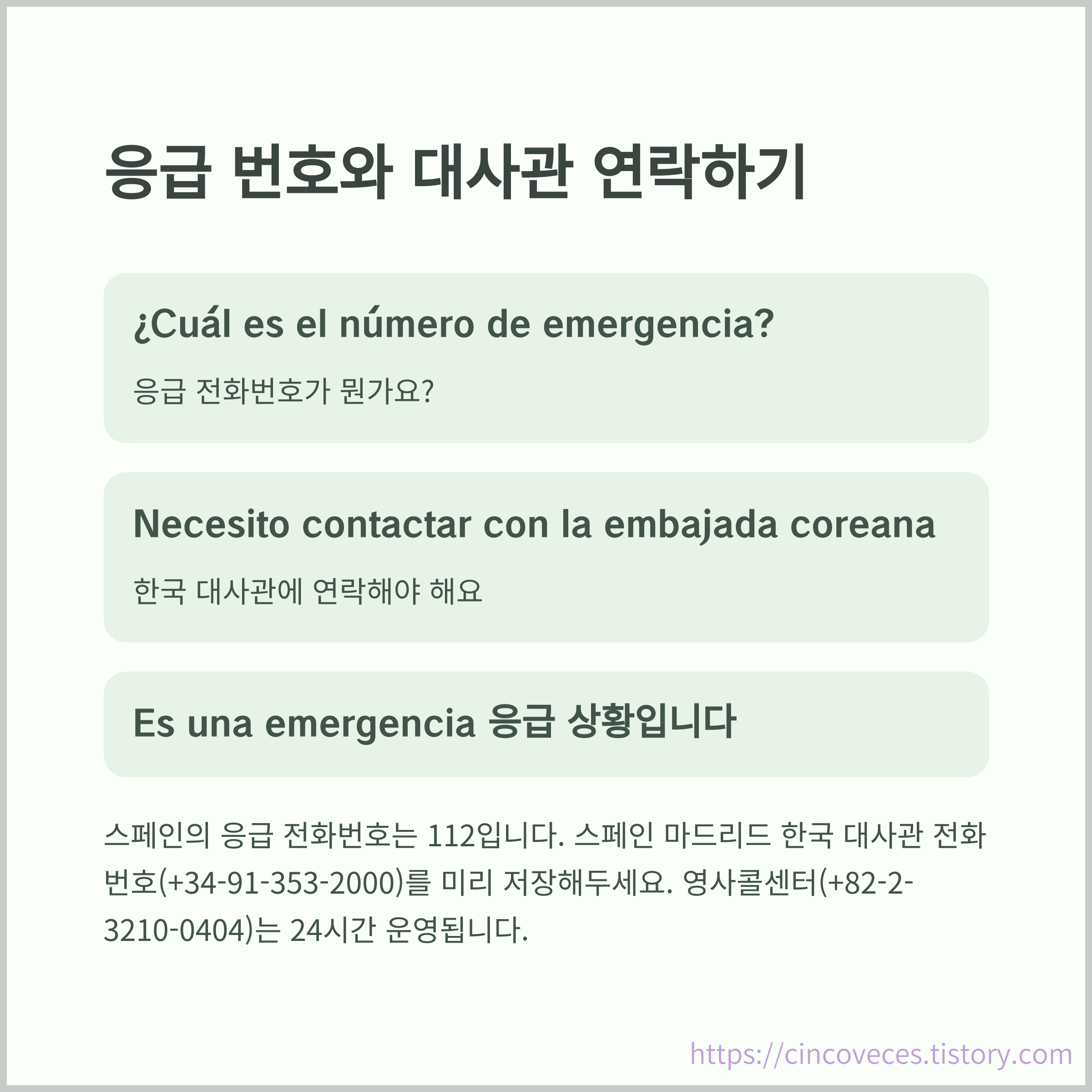 "Necesito llamar a la embajada", "¿Tiene el número de emergencia?"로 긴급 연락을 요청할 수 있습니다.