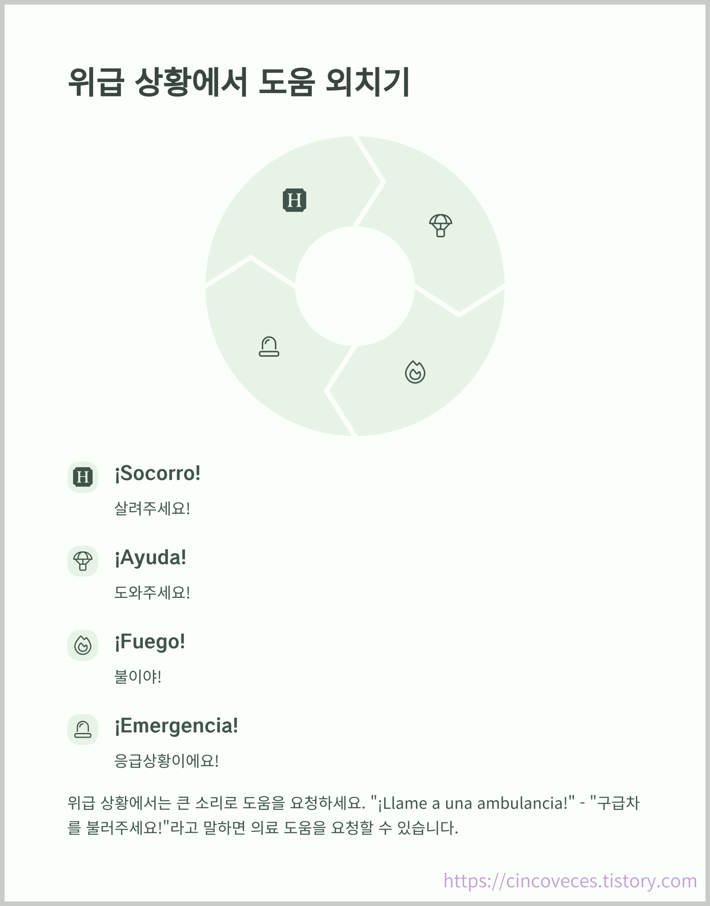 "¡Ayuda, por favor!", "¡Llame a una ambulancia!"는 위급 시 꼭 알아둬야 할 표현입니다.
