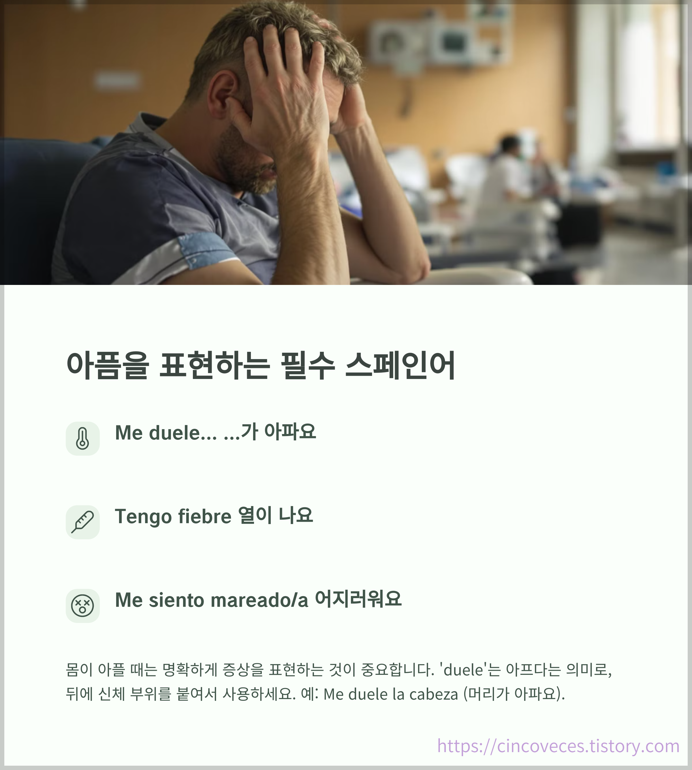 "Me siento mal", "Me duele la cabeza", "Tengo fiebre" 등으로 증상을 표현할 수 있습니다.