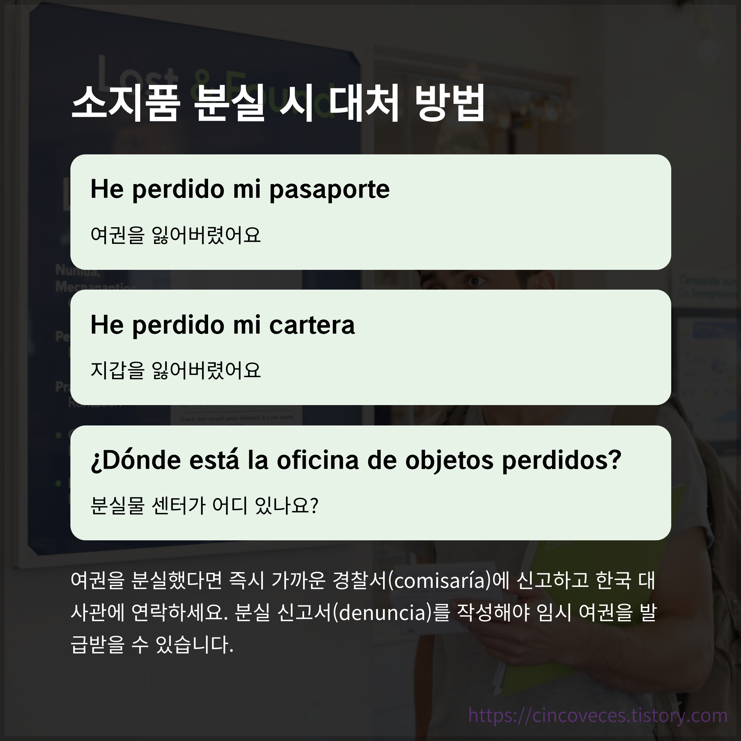 "Perdí mi pasaporte", "Perdí mi cartera", "Perdí mi mochila" 등으로 분실 사실을 알릴 수 있습니다.